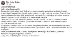 – Ako im se ja ne sviđam, uredu, ali zašto su blokirali svu njenu familiju, brata, sestre?! Htjeli su nešto da prikriju. Već su poduzeli mjere. Šta znam?! Vidjela sam i da se njen muž oglasio. Taj profil je napravljen u njeno ime. Amina je prisiljena da govori. Poznajem svoje dijete, ona je vesela, komunikativna. Imam njenu zadnju poruku, gdje mi je napisala: „Mama volim te najviše na svijetu, oni ne moraju“. Prema njenom mužu ona ne osjeća ljubav, već je to strah. Prijateljici je rekla da je muž odveo na prevaru, jer joj je obećao stan. Bio je zaposlen, ali me doveo u kuću roditelja, gdje sam i dan danas zarobljena. Nema kontakta i ne hoda ni sa kim. Udaljili su je da ne bi ona došla do informacija do kojih smo mi. Onda su oni nama došli u posjetu, ali to nije trajalo ni 40 minuta. Zovnula sam Aminu i rekla: „Hajde sa mamom kaficu“, svekrva njena je rekla: „Gdje je sjela, tu će ostati. Ne smije“, ja sam na to nijema ostala – izjavila je Aminina majka.